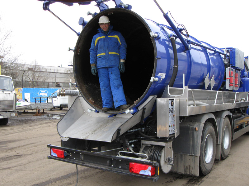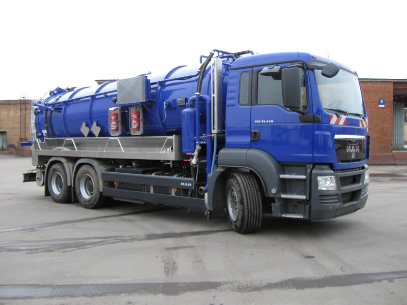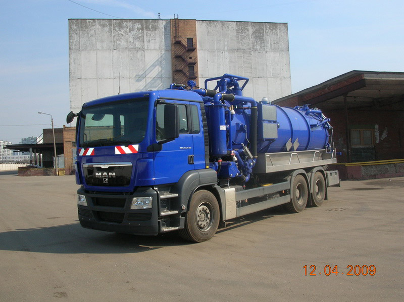 В 1-ом квартале 2009 года наша компания совместно с немецкими инженерами спроектировала и построила илососную машину на базе шасси MAN TGS 33.440. Вместимость грязевой камеры – 17м³. Камера для воды – 1м³. Вакуумный насос Rottec – до 2000 м³/час. Насос высокого давления Speck – 120 л/мин. при 160 бар. Глубина всасывания до 15 м. С помощью данной установки наша компания способна решать задачи по откачке иловых отложений не только в летний период, но и зимой при температурах до -30°С.